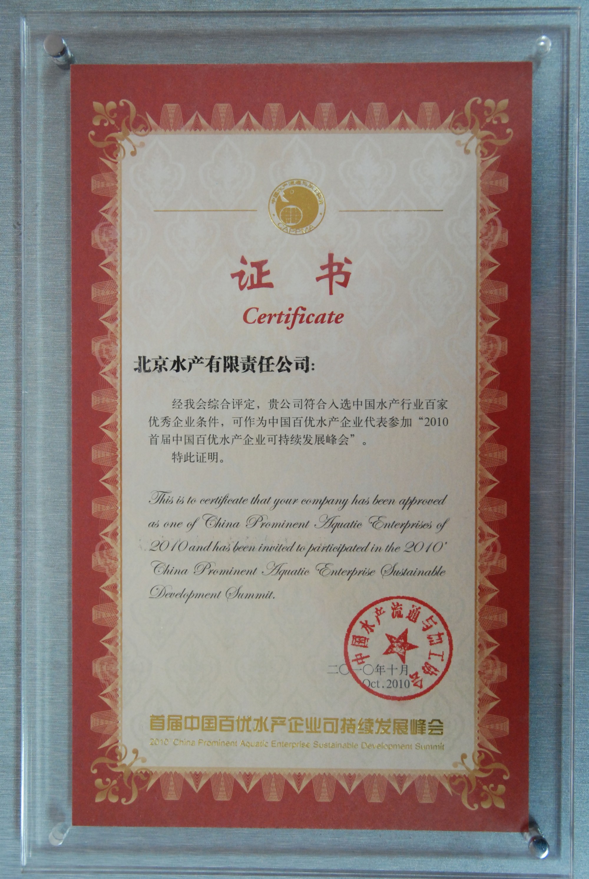 發證機構:   中國水產流通與加工協會 發證時間 :   2010-10-08